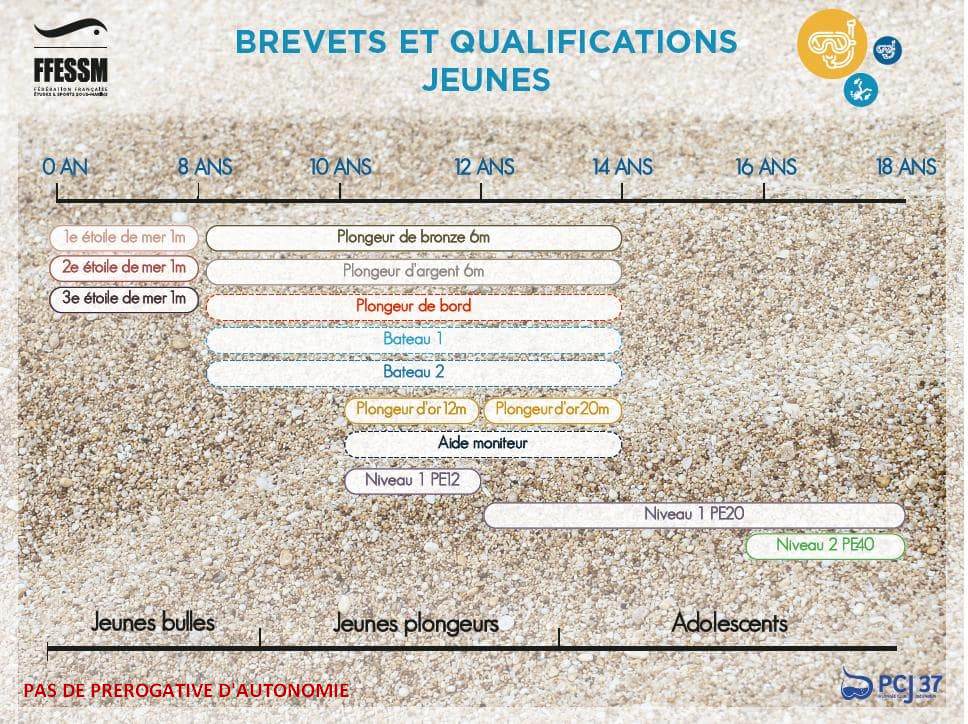 DÉLIVRANCE DES DIPLÔMES : Les diplômes et qualifications sont délivrés par un moniteur E2 au minimum. Chaque niveau est attesté par la délivrance d'une carte. Pour se voir délivrer l'un des niveaux des cursus jeunes bulles ou jeunes plongeurs, il n'est pas obligatoire de posséder le niveau inférieur.